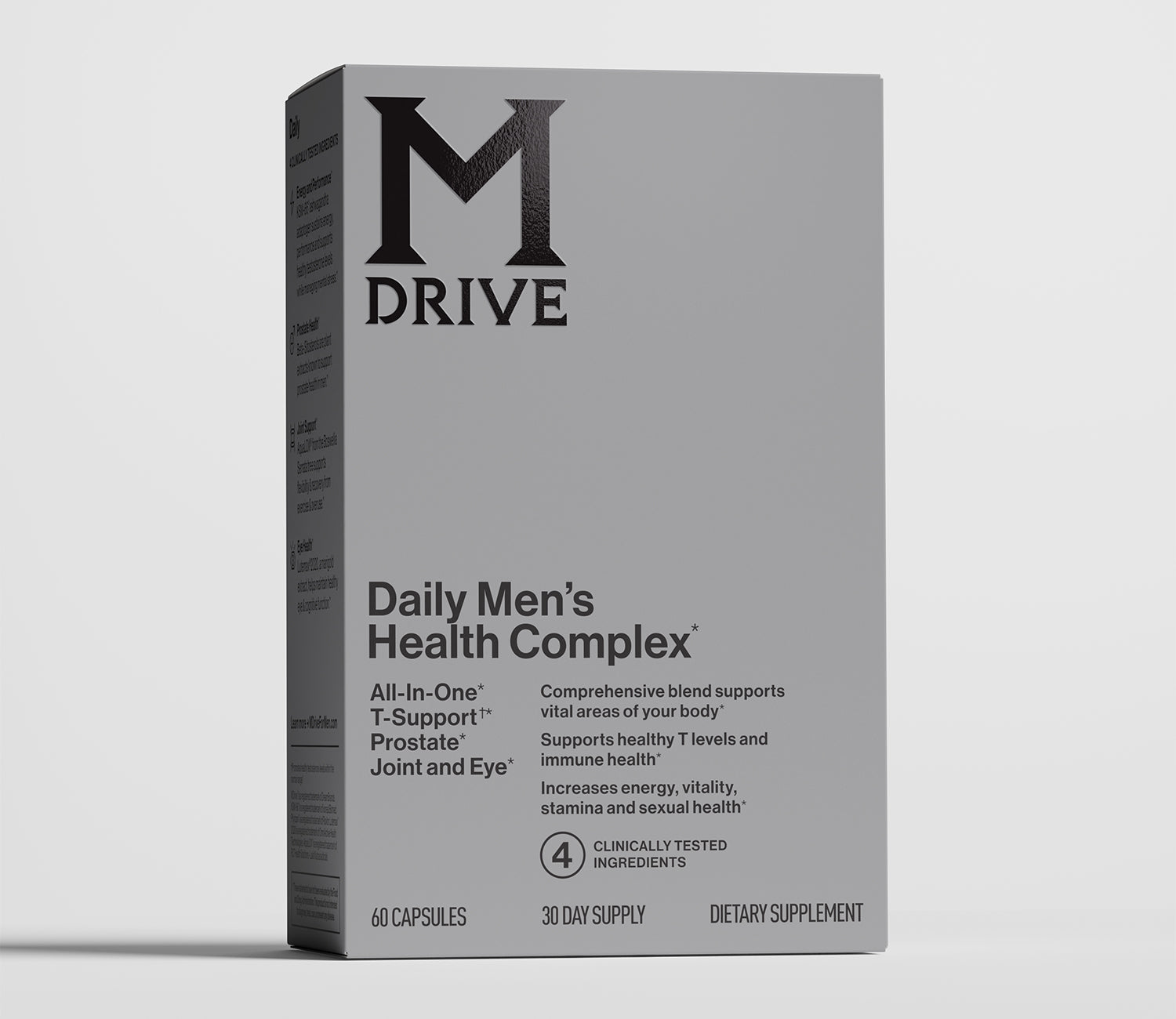 M Drive Daily is a daily men’s health supplement with an adaptogen-based formula, including clinically-tested ingredients shown to support improved energy and testosterone levels, along with stress regulation. It also supports prostate, joint and eye health and cognition. It is caffeine-free, gluten-free and non-GMO.